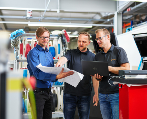 Unsere Maschinen laufen mit unserer eigenen Software, die von unseren Entwicklern programmiert und weiterentwickelt wird. Dabei arbeiten sie Hardware-nah und sehen direkt an den Maschinen, was ihre Codes bewirken. Durch den hohen Innovationsgrad, müssen zudem regelmäßig neue Funktionen und individuelle Kundenwünsche integriert werden. So entstehen maßgeschneiderte Lösungen.